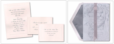 For about $200, you can have 50 of the traditional single panel invitations with double envelopes on the left, plus 50 reception cards and 50 response sets, including printed return envelopes, printed return address on your outer invitation envelopes and all the postage you need to mail the set out and pre-stamp your response envelopes. You can dress up the invitation with a monogram or combination wording at no extra charge.